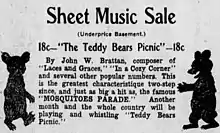 Bratton composed and personally copyrighted it in 1907, and then assigned the copyright to M. Witmark & Sons, New York City, who published it later that year as "The Teddy Bears Picnic: Characteristic Two Step", according to the first page of the published piano score, as well as the orchestral parts Witmark published in an arrangement by Frank Saddler. However, the illustrated sheet music cover gives the title as THE TEDDY BEARS' PICNIC, with apostrophe on "BEARS" and no genre descriptor.[1][2] Irish songwriter Jimmy Kennedy wrote the now familiar lyrics for it in 1932.