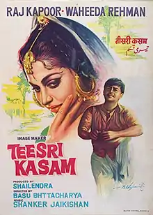 Teesri Kasam (transl. The Third Vow) is a 1966 Hindi language drama film directed by Basu Bhattacharya and produced by lyricist Shailendra. It is based on the short story Mare Gaye Gulfam, by the Hindi novelist Phanishwarnath Renu. The film stars Raj Kapoor and Waheeda Rehman. The duo Shankar–Jaikishan composed the film's score. The film's cinematography was done by Subrata Mitra. Dialogues were written by Phanishwarnath Renu and the screenplay by Nabendu Ghosh.