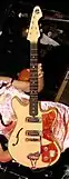 Singer, songwriter Vance Brescia, guitarist and music director for Herman’s Hermits Starring Peter Noone and frequent guest musician with The Monkees, Micky Dolenz and other artists plays a Teisco Del Rey EP-8 model. He has played Teisco guitars since childhood and just before joining Peter Noone in 2001 found this one from the Teisco 1964 line screwed to the wall at a Guitar Center as junk art. He talked the manager into a trade, took the guitar home, rebuilt it and has played it on stage ever since. The light weight of this guitar is a bonus to the sonic attributes.
