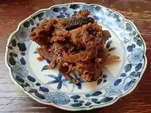 Tekka is a miso-condiment[1][2] that consists of a number of root vegetables (Greater Burdock roots, carrots, Ginger root, and Lotus root) which have been stir-fried and boiled to a concentrated powder. Traditional preparation time used to be 16 hours (on a low fire), yet speedier preparation is possible.