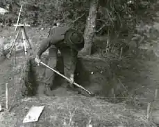 ![]() Archaeologist Frederick West excavating at Teklanika, undated NPS photo | |