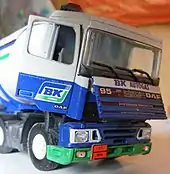 Tekno was known for favoring Swedish auto maker Volvo Cars, making coupés, sedans, and wagons. Some of these models were used by Volvo as promotional models. Tekno had a reputation for accuracy and realism - its Volvo models and many others like the Oldsmobile Toronado and Jaguar X-KE had superb proportions and detail.[6] Tekno trucks were also known for their detail, such as the Ford D-800 tilt-cab decorated for Tuborg Beer which featured thirty-two removable beer cases.[7] Still, in the early 1960s, the company often used the unrealistic, flashy practice of using jeweled headlights, similar to Dinky Toys, Corgi Toys, or Mebetoys.[8]