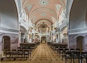 The interior of the cathedral is spacious and light. The pillars which support the gallery are modified visually by the arches which link them and surround the chancel. Profiled wall columns, cornices and the installations form an organic part of the interior.[9] Artist Jurgis Mažeika designed two altars beside the pillars and in the presbytery as well as the pulpit while artist Tomasz Podhajski (Lithuanian: Tomas Podgaiskis) designed three altars in the second storey and the central altar.[10]