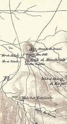 Tel Erani was first documented by Claude Reignier Conder and Herbert Kitchener in their 1872–1877 survey for the Palestine Exploration Fund. They described the contemporary village of Iraq al-Manshiyya and remarked that the site was "evidently ancient and important, and seems possibly to represent the ancient Libnah." The identification of Tel Erani with the biblical city of Libnah was based on the chalk in the hills nearby – the name of the city meaning 'the white' in ancient Hebrew.[3]