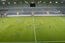 Instead, Stabæk started negotiating with IT Fornebu to take over a lot they owned. They needed a 300 hectares (740 acres) lot which would have a market value of between NOK 60 and 80 million, and Reinsfelt stated that the municipality was willing to help by "maneuver in gray areas within the margins".[12] The club was further pressured by NFF, who were going to limit the exceptions allowed for Nadderud and other stadiums not meeting their criteria.[12] On 29 October, FB and Stabæk signed an agreement whereby Stabæk received a free lot and NOK 50 million, in exchange for FB taking over the commercial properties. The condition was that the municipality allowed a more dense use of the rest of FB's area. This would require a re-regulation of the area, and Reinsfelt estimated that it would not be possible for construction to start until 2006.[13] In November, UEFA changed the rules for artificial turf to state that it had to be green. Until Stabæk's proposal was made, UEFA had not thought that anyone would build a pitch with a non-green turf, and representatives stated that it was because of Stabæk the rule change was made.[14] The plans were nearly terminated in October 2006, after discussion about the planned Fornebu Line—a people mover which would connect Fornebu to Lysaker—stopped the regulation plan.[15] However, in November the final permissions were granted by Bærum Municipality.[16] On 22 December, Stabæk announced that the financing was secured.[17]