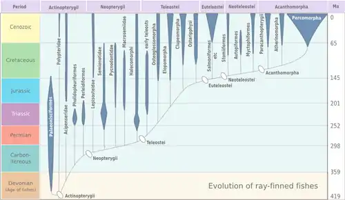 The teleosts were first recognised as a distinct group by the German ichthyologist Johannes Peter Müller in 1845.[9] The name is from Greek teleios, "complete" + osteon, "bone".[10] Müller based this classification on certain soft tissue characteristics, which would prove to be problematic, as it did not take into account the distinguishing features of fossil teleosts. In 1966, Greenwood et al. provided a more solid classification.[9][11] The oldest fossils of teleosteomorphs (the stem group from which teleosts later evolved) date back to the Triassic period (Prohalecites, Pholidophorus).[12][13] However, it has been suggested that teleosts probably first evolved already during the Paleozoic era.[14] During the Mesozoic and Cenozoic eras they diversified widely, and as a result, 96% of all living fish species are teleosts.