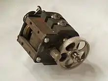 Telegraphy pre-dated telephony and magnetos were used to drive some of the early printing telegraph instruments. Manual telegraphy with keys and reception by either a needle instrument or a syphon recorder could be powered by batteries. The later automatic and printing instruments, such as the Wheatstone ABC telegraph, required greater currents[1] that could be delivered by a hand-cranked magneto. A hand-crank was used to rotate a belt drive that increases the rotational speed of an armature with a pair of coils between the poles of a stationary horseshoe magnet.