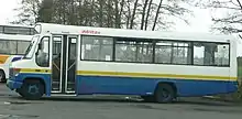 Wiltax's P701 LCF, a Mercedes-Benz Vario/Plaxton Beaver 2 parked at their depot. It was on loan from another Tellings-Golden Miller company at the time.