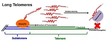 At cells with long telomeres, TERRA is proposed to act as a negative regulator of telomerase activity. This direct inhibitor function acts through base-pairing of the tandem repeats found throughout TERRA's 3'-end to the complementary RNA template region of telomerase.[5] The complementary base pairing of the TERRA transcript may work to compete with telomerase's DNA substrate when TERRA expression is at its highest, preventing telomerase from further lengthening telomeres. TERRA may also interact with the catalytic reverse transcriptase subunit (TERT) of telomerase, thereby acting as an allosteric inhibitor of telomerase function and preventing the addition of further telomeric repeats. This model of TERRA-telomerase interaction is supported by experimental evidence where TERRA-mimicking (UUAGGG)3 oligonucleotides have been shown to lead to complete inhibition of telomerase activity in vitro;[2][16] however evidence of this relationship in vivo remains elusive.