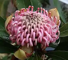 - Telopea 'Galaxy' has flowerheads with pinkish red tepals and white tips to the styles, surrounded by large bracts.[29]
