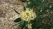 The flowers of the Tasmanian waratah provide ample nectar and hence are a food source for bird visitors to the garden.[34] The species can be propagated by seed, though seedlings may succumb to damping off.[25] Growing in a natural shady location delays flowering by two to four weeks, while growing in a cooler conditions (due either to latitude or altitude) can delay flowering by up to six weeks. Pruning flower heads can promote subsequent growth of leaves and branches.[35] It grows best in a cool climate with ample water and good drainage, and has done well in cultivation in England. The Royal Horticultural Society gave it an Award of Merit in 1934 and a First Class Certificate in 1938.[5] The relationship between light duration and intensity, temperature, vegetative growth and flower production is poorly known.[35] Yellow forms in cultivation were originally propagated from a plant found on Mount Wellington.[5]