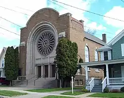 B'Nai Israel's synagogue building from 1929 to 2019 was a three- to four-story tall, light brown brick structure with terra cotta decorative details.[3] (Before the Temple was constructed, the Olean Jewish community had rented facilities to serve as a house of worship.) Built in 1929, it measures 85 feet long, 42 feet wide, and 50 feet tall.[3] The front facade features a massive arched terra cotta portal encircling a large, round stained glass window.[3] It was listed on the National Register of Historic Places in 2012.[1]