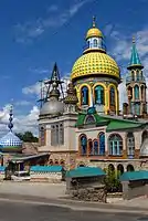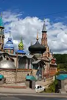 The Temple of All Religions (Russian: Храм всех религий, Tatar: Барлык диннәр гыйбәдәтханәсе) or the Universal Temple (Russian: Вселенский храм) is a unique architectural complex in the Staroye Arakchino Microdistrict of Kazan, Russia. It consists of several types of religious architecture including an Orthodox church, a mosque, and a synagogue, among others. It is currently under construction since 1992, started by local artist and philanthropist Ildar Khanov[1] (1940 - 2013). The structure now serves as a cultural center and a residence for Khanov's brother and sister, who both continue to serve as guides and supervisors of the complex.[2]
