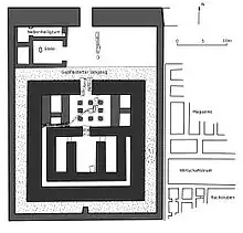 However, the Austrian excavations showed that under the temple stretched an older settlement, which could be dated by pottery to the first half of the 12th Dynasty. The temple itself was given a new construction date at c. the mid-12th Dynasty, probably at year 5 of Senwosret III, as indicated by the above-mentioned stela.[5] The entrance was on the north side, where the walls were stronger and it seems that they formed a brick pylon. The entrance was at one time perhaps framed by inscribed limestone slabs.[6] The proper temple stood within an open courtyard. On the west side behind the main gate there was small temple, while the main one was opposite the north entrance. Behind the entrance of the temple proper stood a courtyard with perhaps eight columns. Some stone column bases were still found. East and west of this courtyard were on either side two smaller chambers, while on the south side were three cult chapels. This temple was placed within a larger complex. On the east side were excavated remains of storage and administrative buildings.