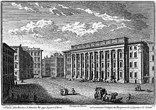 The Temple of Deified Hadrian was located within the Campus Martius (The Field of Mars) in close proximity to the earlier Solarium Augusti and later constructed Column of Marcus Aurelius. In the Notitia it is also listed as located in Regio IX near the Baths of Alexander Severus and Agrippa.[2] The temple of Matidia (Hadrian's mother-in-law) also likely stood just to the west of the Temple of Hadrian so it has further been argued for the presence of monumental entrances at both ends of the temple though the remains offer no confirmation.[2] The temple itself also stood within a spacious precinct surrounded by a colonnade, parts of which were uncovered by Rodolfo Lanciani in his early excavations of the surrounding spaces.[2]