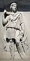 A series of marble pedestals and panels (24 in total so far) were found in proximity to the temple of Hadrian and have thus been thought to have formed a part of its decorative program.[3] According to Richardson, the face of the temple podium was broken into panels, whereby vertical plinths beneath the columns illustrated allegorical figures of the provinces of the empire in high relief, while framed panels under the intercolumniations bore simple trophies of armor and weapons but at a grander size.[2] Sixteen of the figures of provinces remain well preserved and are housed between five different collections in Rome and Naples.[2] They were carved in relief with personifications of cities and peoples from the Roman Empire, alternating with military and naval trophies.[3] The building materials employed were Proconnesian marble compatible with the order of the temple.[3] However, it is still debated whether or not those remains are directly from the Temple of Hadrian, or from other large public buildings that surrounded it.[3] Moreover, debate continues in regards to the identification of provinces that are illustrated as some argue that there were originally 25 in order to account for various personifications appearing on the coinage of Antoninus Pius, distinguishable for their costume and weapons.[2]