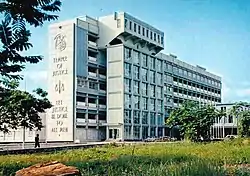 The Temple of Justice is a large building of modern style which was designed by Tommaso Valle in the 1960s on Capitol Hill in Monrovia, Liberia.[1] Dedicated in 1965,[2] it houses the Supreme Court of Liberia, auxiliary courtrooms, and legal offices. It suffered relatively little damage during the First and Second civil wars that lasted from 1989–2003, but poor maintenance and lack of electricity made the Temple unpleasant to work in.