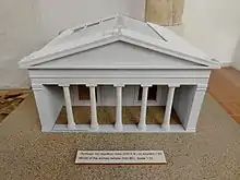 The facade was formed of five columns in antis. The columns are in the Samian style, but unfluted. Very unusually, the columns show a slight contraction in width with increasing height, whereas Archaic and Classical Greek columns as a rule increase in thickness towards the top (entasis). The leafy wreathed capitals were not carved in the round, but were instead painted onto the double echinus of the capitals, while the abacus was decorated with a band.