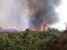 The Tenaja Fire was a wildfire in the rural community of La Cresta southwest of Murrieta in Riverside County, California, United States, located 80 miles from Los Angeles.[2] The fire broke out on Wednesday, September 4, 2019 and ballooned to 1,926 acres (8 km2) over the course of two days. The blaze, dubbed the Tenaja fire after igniting along Tenaja Road and Clinton Keith Road in La Cresta, forced the evacuation of over 1,200 people and lead to the closure of multiple school districts in the Murrieta, Perris and Lake Elsinore area due to the poor air quality.[3][4] The exact cause of the fire remains under investigation although several sources cited the possibility of lightning being the direct cause.[5] Two structures were damaged as a result of the fire and one firefighter suffered minor injuries.[6] The fire was contained on September 14 and had burned 1,926 acres (779 ha).[1]