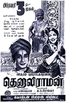 Tenali Raman is a 1956 Indian Tamil-language historical drama film produced and directed by B. S. Ranga based on Ch. Venkataramaiah's stage play Tenali Ramakrishna. Produced for the banner Vikram Productions, the film stars N. T. Rama Rao, Sivaji Ganesan, V. Nagaiah, P. Bhanumathi and Jamuna. Ranga also handled the cinematography while P. G. Mohan edited the film. Viswanathan–Ramamoorthy composed the soundtrack and background score.