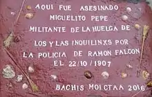 In 1906 the Argentine Regional Workers Federation (FORA) led the campaign for the reduction of rents and formed the League of Struggle against High Rents and Taxes.[16] In August 1907, through a municipal decree, there was a tax increase which was transferred to the price of the rooms located in the tenements. In this context, the tenement house on Calle Ituzaingó went on strike, refusing to pay the rent.[17] The strikers formed a central committee in search of new adhesions, reduction of work to 8 hours a day and a salary increase. By the beginning of October 1907, around 1000 conventillos went on strike, the movement spread through the cities of Rosario and Bahía Blanca.[2] As a result of the repression, the anarchist militant Miguel Pepe was assassinated by the police under orders of the Chief of Police Ramón Falcón.[18] In 1909, Falcón was in turn assassinated by an anarchist militant, of Ukrainian origin, named Simón Radowitzky.