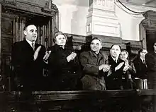 As a reward for accomplishing this mission, Georgescu was promoted to Minister of Interior once Petru Groza's government took power on March 6, 1945. He also served on the Politburo, was the Secretary of the Party's Central Committee, and ran the United Workers' Front, which coordinated the actions of communists and social democrats. As Minister of Interior he contributed to the country's denazification and later to the reorganization of the law enforcement system along the Soviet model, supervising the establishment of several penal colonies and coordinating a dekulakization campaign. Georgescu was also instrumental in setting up the administrative divisions of the Romanian People's Republic on the Soviet model.[4] Along with Gheorghiu-Dej, Pauker, and Vasile Luca, he was considered one of leaders directing the new regime's policy, as highlighted by the popular epigram "Ana, Luca, Teo, Dej / Bagă spaima în burgheji" (Ana, Luca, Teo[hari], Dej / Put the fear into the bourgeois").