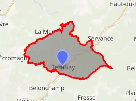 Ternuay lies on the D486 running north from Lure to le Tillot. Together with the villages of Melay and St Hilaire it forms a commune lying between that of Melisey and Sevrance. There is one restaurant, a branch of the post office by the bridge over the river Ognon, a mobile wood-fired pizza truck that operates by the church regularly. The fountain serves water from the St-Hilaire spring.
