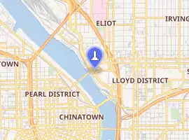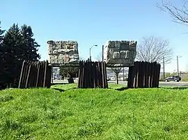 Terra Incognita, designed by Ilan Averbuch, was installed at North Broadway and North Larrabee Avenue, at the foot of the Broadway Bridge, in Portland's Rose Quarter in 1995. The gate-like sculpture is made from steel, wood, stone and copper, and measures 15 feet (4.6 m) x 40 feet (12 m) x 6 feet (1.8 m).[1][2] It forms five cubes in a "strong positive negative pattern".[2] The three base cubes are bundled tree trunks, and the two cubes suspended by the lower three are stone piles. According to the Regional Arts & Culture Council, which administer the sculpture: