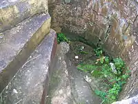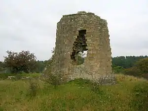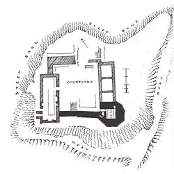 The small, irregular, octangular 14th-century vaulted tower has a splayed base[4][5] and is constructed of courses of square ashlar masonry,[6] 6 m (20 ft) high, with walls 2.0m thick, is the earliest part of the structure, together with the wide wall at the north-west. The tower was vaulted, with three ribs, and an entrance from the courtyard via a narrow passage leading to a partly surviving wheel-stair.[4] The remains of outbuildings lie to the north and a well was recorded within the keep; a sizeable courtyard lay within the complex.[7] The remains have seen some restoration[8] and the lines of excavation trenches are apparent. The whereabouts of the records of the late 19th-century excavations is not known for certain.[9]