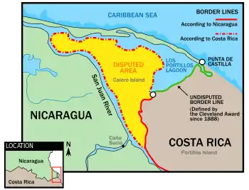 In October 2010, a dispute began between Costa Rica and Nicaragua regarding the dredging of 33 kilometres (21 mi) of the San Juan River by the Nicaraguan government in the area of Isla Calero.[12] Costa Rica claims that violation of its sovereignty took place as Nicaraguan troops had entered Costa Rican territory, and the dredging of the river caused environmental damage in the wetlands at Isla Calero, which is part of the island nature reserve, in an area that is owned by the Costa Rican Ministry of the Environment.[13][14]