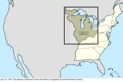 | July 13, 1787 | The Territory northwest of the Ohio River, ceded earlier by Virginia, was organized and commonly became known as the Northwest Territory.[56][57] | ![]() |