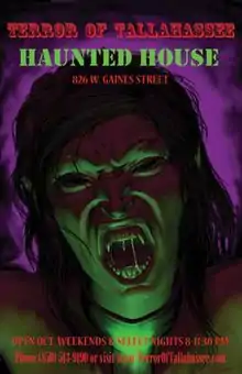 Terror of Tallahassee is an annual haunted attraction that opens every October in Tallahassee, Florida. With a performance area spanning more than 20,000 sq ft (1,900 m2) [1], it is one of the largest haunts in Florida. Unlike the corporate haunts with which it competes, Terror of Tallahassee does not admit patrons in a continuous line, but rather, in small groups. It also forgoes modern animatronics in favor of elaborate illusions, gruesome special effects, and a large cast of performers [1]. “Monsters, murderers, and madmen menace isolated customers as they try to traverse the long, twisting passages in the dark" [2]. Because of the intense scares, it is rated PG-13 and parents are cautioned against sending their kids [3].