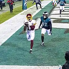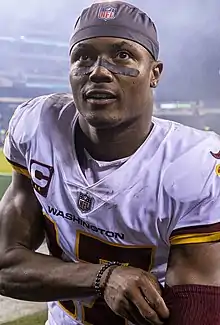 Terry McLaurin (born September 15, 1995) is an American football wide receiver for the Washington Commanders of the National Football League (NFL). He played college football at Ohio State and was drafted by Washington in the third round of the 2019 NFL Draft. McLaurin was named to the 2019 PFWA All-Rookie Team after recording over 900 receiving yards with seven touchdowns.