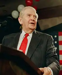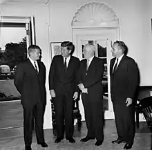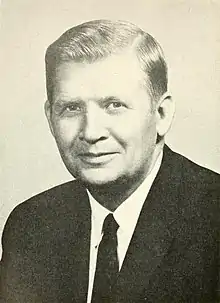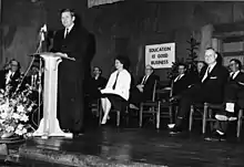 Sanford faced a strong opponent for the governor's race in Robert L. Gavin, a moderate conservative Republican attorney. Gavin denounced Sanford as a tool of the liberal leadership of the national Democratic Party and organized labor.[81] Although his reputation had been harmed by his early endorsement of Kennedy, Sanford enthusiastically campaigned for the two of them.[84] He attacked Gavin for contradicting himself on several occasions and for displaying a lack of familiarity with certain issues.[85] In the November election both Kennedy and Sanford won the offices they sought. Kennedy won the popular vote in North Carolina by a small but solid margin. Sanford won with 54.3 percent of the vote, 131,000 votes over Gavin, but his performance was lackluster for a Democrat seeking state office at the time.[81] Sanford remained proud of his gubernatorial victory for the rest of his life, feeling he had defeated a racist candidate (Lake) and avenged Graham's loss in 1950.[86] Out of appreciation for Sanford's contribution to his campaign, Kennedy appointed Hodges to his cabinet as United States Secretary of Commerce.[87] Sanford arranged for Bennett to assume the chairmanship North Carolina Democratic Party.[88] In that capacity, Bennett organized continued backing for Sanford within the party and eased the way for many of Sanford's supporters to advance in its ranks.[89]