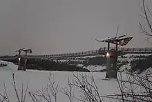 The Terwillegar Park Footbridge is a pedestrian bridge that crosses the North Saskatchewan River in Edmonton, Alberta, Canada. At 262 metres (860 feet) in length, it is the longest stressed ribbon bridge in Canada and second longest in the world after the David Kreitzer Lake Hodges Bicycle Pedestrian Bridge in Escondido, California, United States.[1] The bridge is a first for the city and was built to connect Terwillegar Park in the southern side with Oleskiw River Valley Park on the north side of the river. It opened to the public on October 21, 2016.[2]