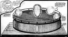 With the fair celebrating the 400th anniversary of Christopher Columbus's arrival in the New World, the "Egg of Columbus" exhibit, building on the apocryphal 15th century story of the "Egg of Columbus" (where the explorer stood an egg on end by smashing its bottom), is described as going "one better" by using a magnetic field to stand an egg on end.[2] It presented the viewer with a flat round wooden surface surrounded by a wooden rim. Inside this rim it performed Christopher Columbus's feat by spinning a copper egg, larger than an ostrich egg, in a rotating magnetic field causing it to stand on end on its major axis due to gyroscopic action.[3] The display also included round copper balls that seemed to orbit around the edge similar to the way planets move. Whenever the large rotating magnetic field set up by the Egg of Columbus was turned on it impressed the public by spinning various magnetized metal balls and painted metal disks on the display table and even small disks inside vacuum bulbs placed at some distance around the Electricity Building.[4][5]