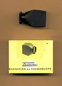 The Tessina (officially created by Arnold Siegrist) is a high-quality 35mm camera patented by Austrian chemical engineer Dr. Rudolph Steineck in Lugano Switzerland, manufactured by Siegrist in Grenchen Switzerland. It was introduced in 1957 and distributed by Steineck's company Concava S.A and remained in production up to 1996. The Tessina takes 14x21 mm pictures on standard 35 mm film (loaded into a special cassette), making it one of the few subminiature cameras to use the format. It is a very small (2.5x2x1 inch) twin lens reflex, with two 25 mm f/2.8 Tessinon lenses, one for taking the picture, the other for viewing on a tiny ground-glass focusing screen on top of the camera. A 45° mirror is employed to bend incoming light onto the film, which lies along the bottom of the camera rather than the back to save space. Apertures are continuously variable down to f/22, and shutter speeds range from 1/2 to 1/500, and B. The Tessina 35, Tessina L can focus down to 9 inches, Tessina Automatic 35mm to 12 inches. The film is advanced via a clockwork master spring built into the takeup spool, with a pullout winder like the crown on a wristwatch. Each winding can last up to 8 exposures.