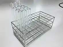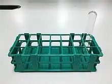 Test tube racks are laboratory equipment used to hold upright multiple test tubes at the same time. They are most commonly used when various different solutions are needed to work with simultaneously, for safety reasons, for safe storage of test tubes, and to ease the transport of multiple tubes. Test tube racks also ease the organization of test tubes and provide support for the test tubes being worked with.[1]
