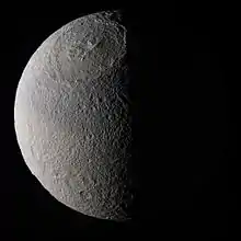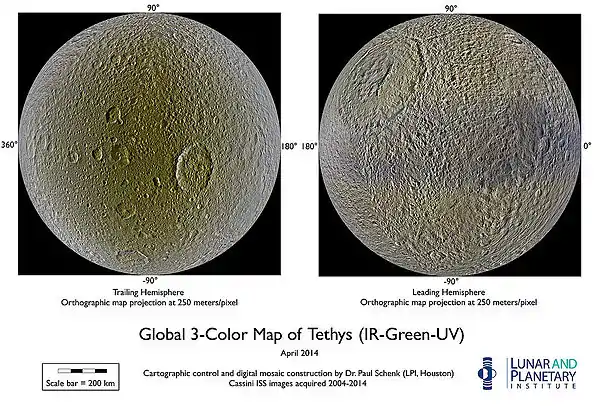 Cassini's observations allowed high-resolution maps of Tethys to be produced with the resolution of 0.29 km.[58] The spacecraft obtained spatially resolved near-infrared spectra of Tethys showing that its surface is made of water ice mixed with a dark material,[26] whereas the far-infrared observations constrained the bolometric bond albedo.[11] The radar observations at the wavelength of 2.2 cm showed that the ice regolith has a complex structure and is very porous.[25] The observations of plasma in the vicinity of Tethys demonstrated that it is a geologically dead body producing no new plasma in the Saturnian magnetosphere.[59]