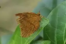 The head, thorax and abdomen are dark yellowish and reddish brown. The wings are yellowish and reddish brown. The hindwings are more uniform reddish brown. On the underside, there are dark striations and both the forewing and hindwing have three grey spots in the discal cell. There are four pale rufous bands along the medial, postmedial, submarginal region.[5]