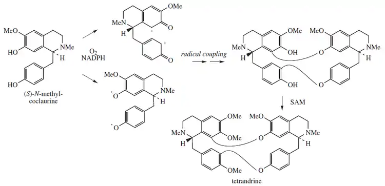 Tetrandrine is biosynthesized from a free radical coupled dimerization of S-N-methylcoclaurine:[14]