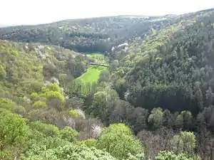 Die Teufelsrutsch ("Devil's Slide") is a densely wooded porphyry knoll in Rhenish Hesse, Germany. It is a popular place for excursions with wonderful views over the Wiesbach valley. The name "Devil's Slide" was inspired by a local tale, according to which the residents of Wendelsheim (a nearby village) once tricked the devil into sliding down the stony slope on his bare bottom. Thereafter he was never seen again.