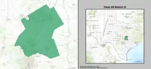 Texas's 31st congressional district of the United States House of Representatives covers a strip of central Texas from the northern Austin suburbs up to Temple.