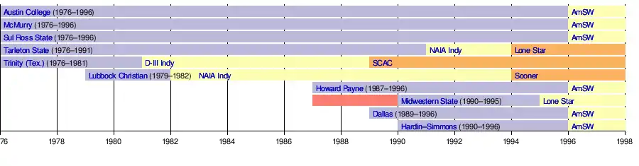 | McMurry University | War Hawks | Abilene | 1976–77 | American Southwest (1996–97 to 2011–12) Heartland (NCAA D-II) (2012–13 to 2013–14) |