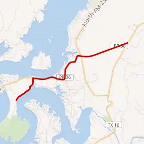 PR 36 begins at the main entrance for the Boy Scouts of America camp, Camp Constantin, and the YMCA camp, Camp Grady Spruce; the main road of the highway travels through the former.[2] The highway travels in close proximity to Possum Kingdom Lake's southern shore, before reaching FM 2951. The highway turns towards the east, traveling through the small town of Pickwick where it intersects FM 2353. Leaving Pickwick, PR 36 travels away from the lake, ending at SH 16, about 10 miles (16 km) west of Graford.[3][4]