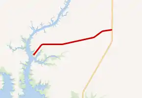 RE 2 begins at the Rough Canyon boat-launch ramp on the Amistad Reservoir in the Rough Canyon Colonia region of the Amistad National Recreation Area.[2] From this terminus, the highway proceeds as a two-lane, paved road, which travels through a small parking lot and turns northeastward. The road continues northeast as it passes the Rough Canyon Marina and the Rough Canyon Colonia camping area on the eastern edge of the park, as well as several houses and independent camp sites. The highway intersects Cam Real Road, which leads to the Devils Shores community and the surrounding area. The route bends eastward, passing the Rough Canyon Inn and a small parking lot and intersecting a small road before it continues into rural areas again. Proceeding along a small ridge, the highway bends northeastward and travels over a small unnamed wash before reaching its eastern terminus with US 277/US 377.[3][4]