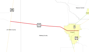 The western terminus of SH 141 is at US 281 (Future I-69C) in Jim Wells County; the continuation past US 281 to Benavides is designated FM 2295. The route travels east into Kleberg County and into the city of Kingsville, where it ends at US 77 (Future I-69E).[1][2]