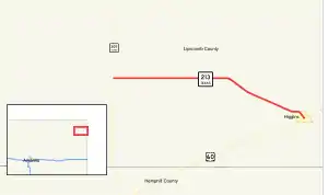 State Highway 213 (SH 213) is a short state highway running from near Lipscomb to Higgins in the eastern Texas Panhandle. The route was conditionally designated along its current route on September 11, 1934, but had yet to be constructed by 1938.[3] On September 1, 1988, the section concurrent with SH 305 to Spur 188 was cancelled. [4]