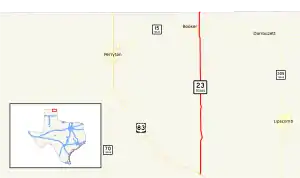 State Highway 23 (SH 23) is a state highway in the U.S. state of Texas maintained by the Texas Department of Transportation (TxDOT). The highway, located in eastern Lipscomb County in the Texas Panhandle, begins at US 83 northwest of Canadian and extends northward through the town of Booker to the Oklahoma state line. The highway's route designation is numerically continuous with subsequent routes in Oklahoma and Kansas and, together with Oklahoma State Highway 23 and Kansas Highway 23, forms part of a single route from US 83 in Texas to US-83 near Selden, Kansas.
