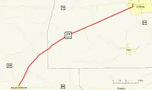 SH 315 begins at a junction with US 259 in Mount Enterprise.[2] The route travels to the northeast through eastern Rusk County, intersecting FM 95 and FM 840.[3] Continuing to the northeast, the highway enters Panola County, in which it has junctions with FM 348, FM 1971, and FM 1970 in the community of Clayton. SH 315 then enters Carthage, where it intersects SH 149. The route travels through the western portion of Carthage before reaching its eastern terminus at Bus. US 79.[4]